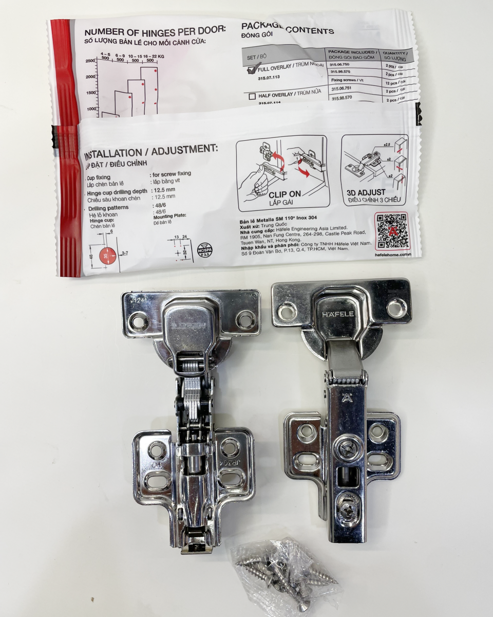 Bản lề âm, giảm chấn Hafele được làm bằng thép bền bỉ, được test mẫu thử với đóng mở 200.000 lần (CE). Kích thước bản lề lắp đặt phù hợp với hầu hết các mẫu cửa tại Việt Nam