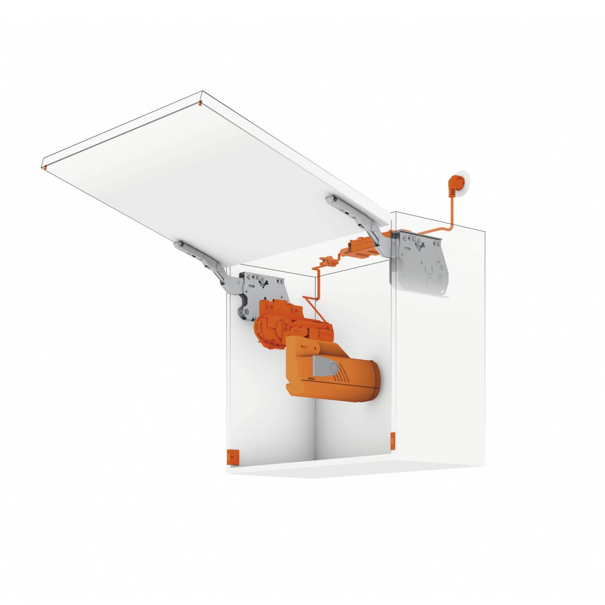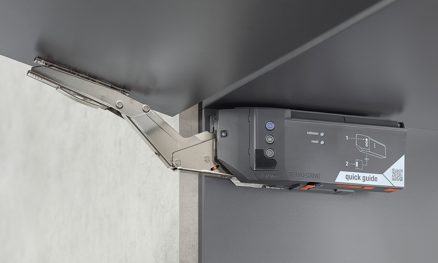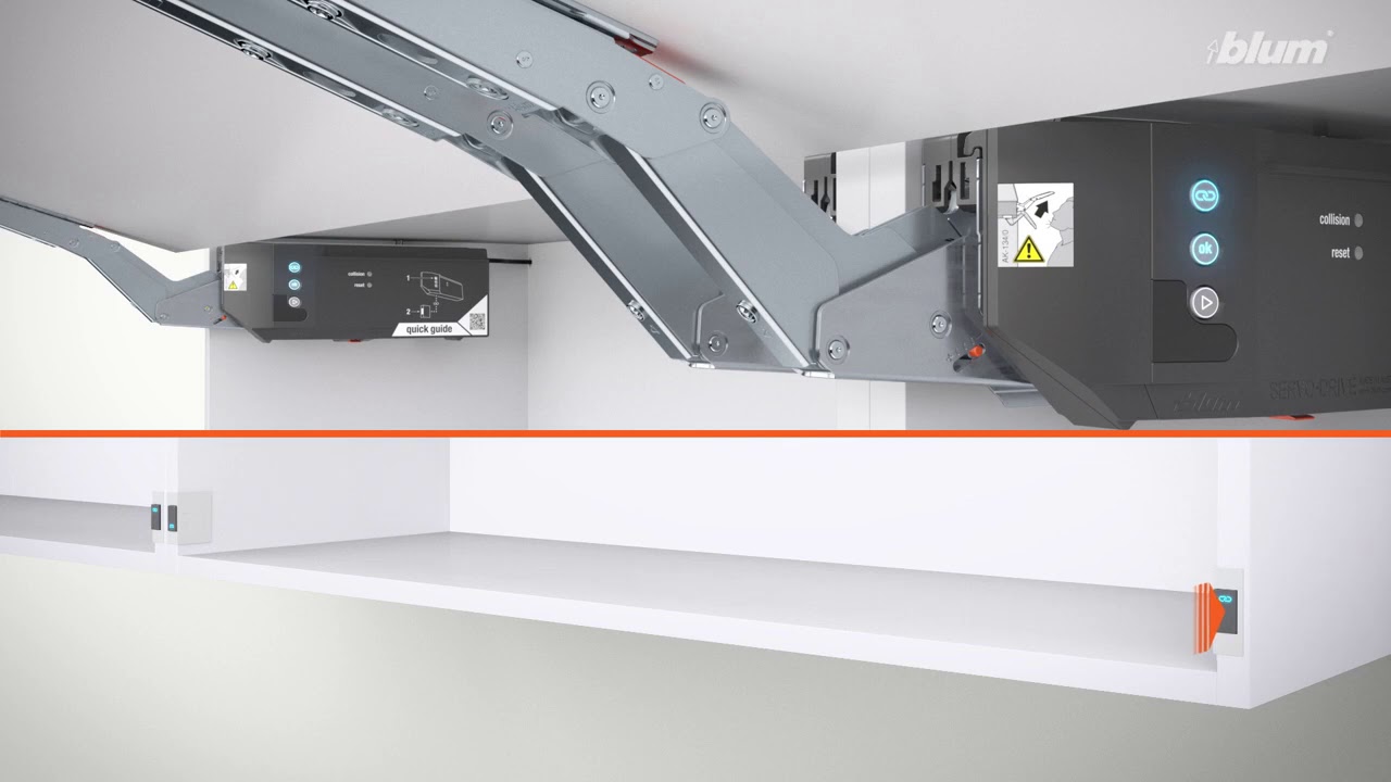 - Chức năng: Thiết bị mô tơ hỗ trợ bộ tay nâng Aventos HK top nâng hạ bằng điện, giúp tủ có thể mở bằng chạm nhẹ vào trước cánh tủ hoặc đóng bằng nhấn nút đóng;