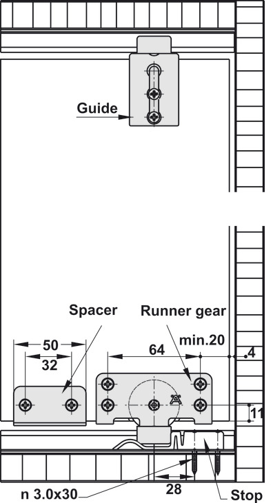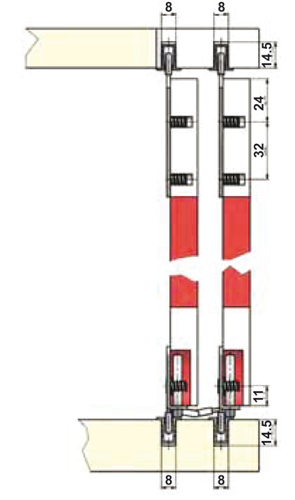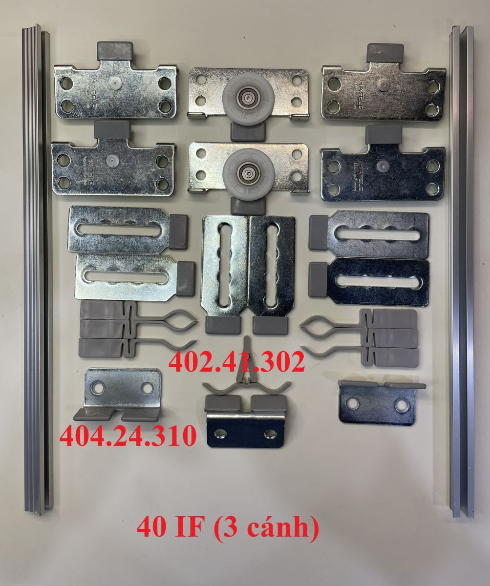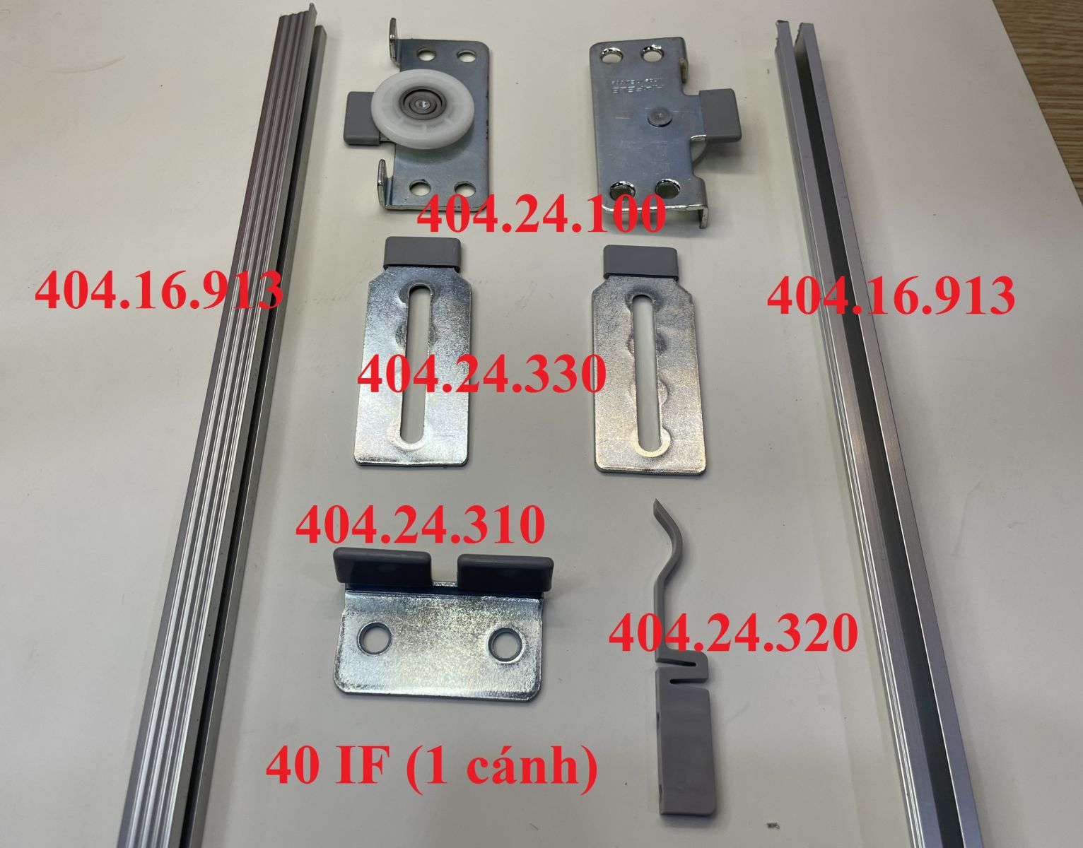 Sản phẩm: 04 bánh xe 404.24.100, 04 dẫn hướng 404.24.330, 02 chặn cửa 404.24.320, thanh nối ngang 404.24.310 (không bao gồm ray trượt và dẫn hướng 404.16.913)