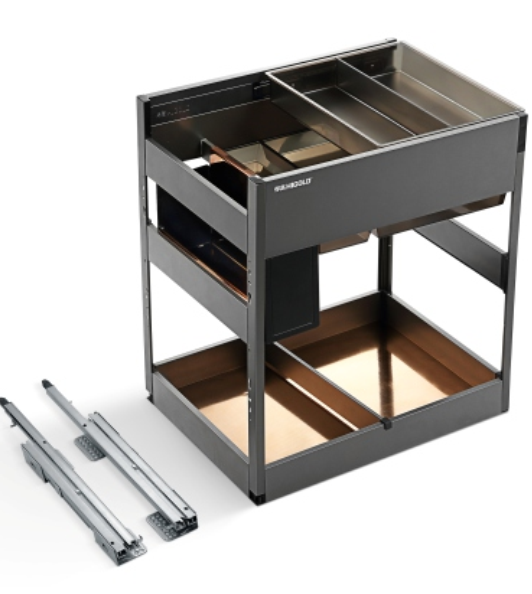 Đóng bộ sản phẩm: thùng khay, khung và ray trượt toàn phần giảm chấn.