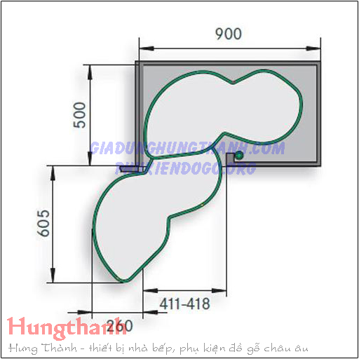 * Thông số kỹ thuật giá góc hình lá Hafele Kessebohmer LeMans II 450 mm mở trái 541.32.671: