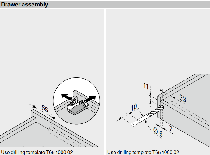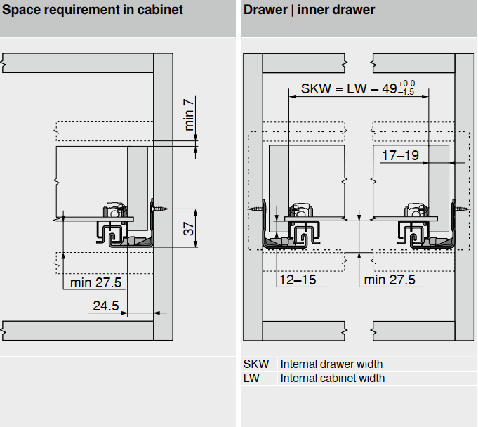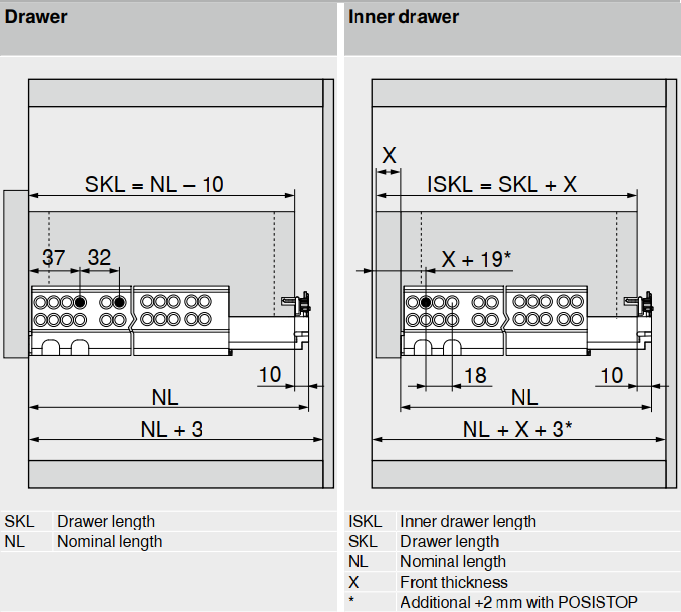 Khoảng hở ngăn kéo tới vách mỗi bên 5-7.5mm Chiều sâu ngăn kéo: Dài ray (NL) -10mm Chiều sâu tủ: Dài ray (NL) +7mm |