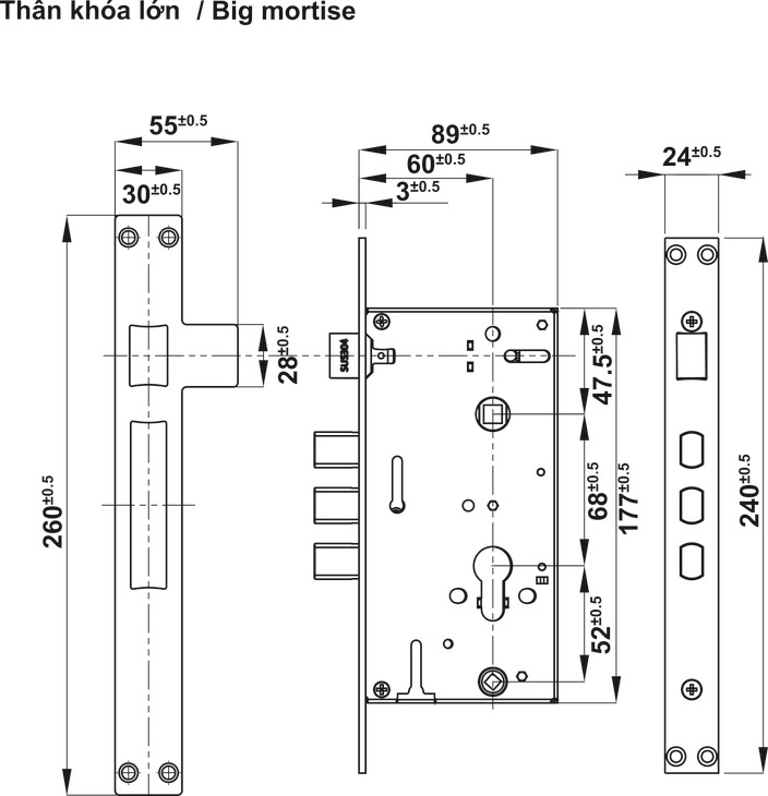 - Khóa có thể phù hợp lắp loại thân to (60x68mm), thân nhỏ (50x50mm).