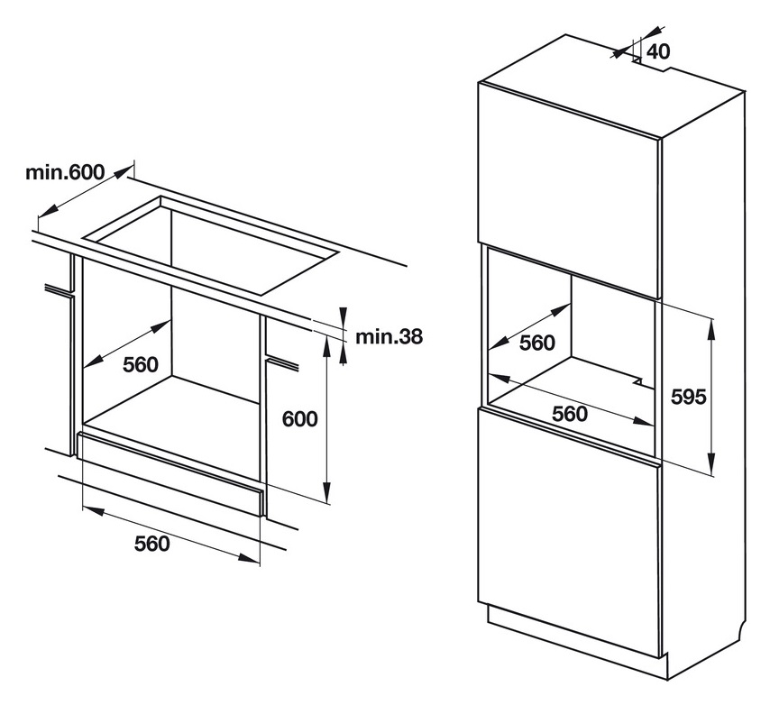 - Lắp đặt (xem chi tiết tại hướng dẫn lắp đặt: kết nối tiếp địa, lắp gọn dây dẫn). Đối với lắp đặt lò nướng dưới bếp nấu cần đảm bảo khoảng không thủy lưu thông ít nhất là 45mm.