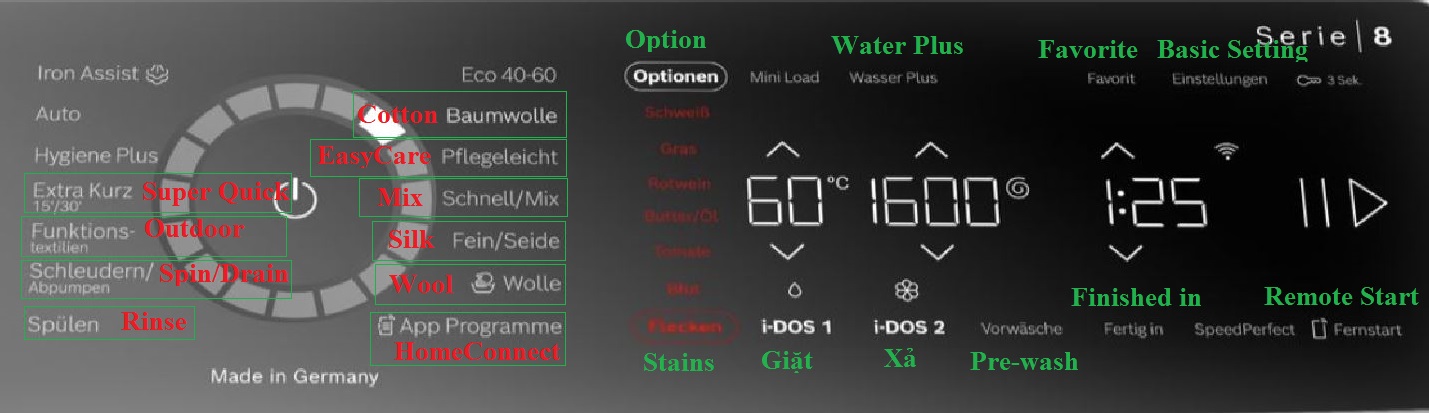 - Định lượng chất phụ gia (i-DOS 1): kích hoạt chế độ lựa chọn thông minh định lượng chất tẩy rửa, mềm vải dạng lỏng cho giặt cơ bản, tiêu chuẩn.