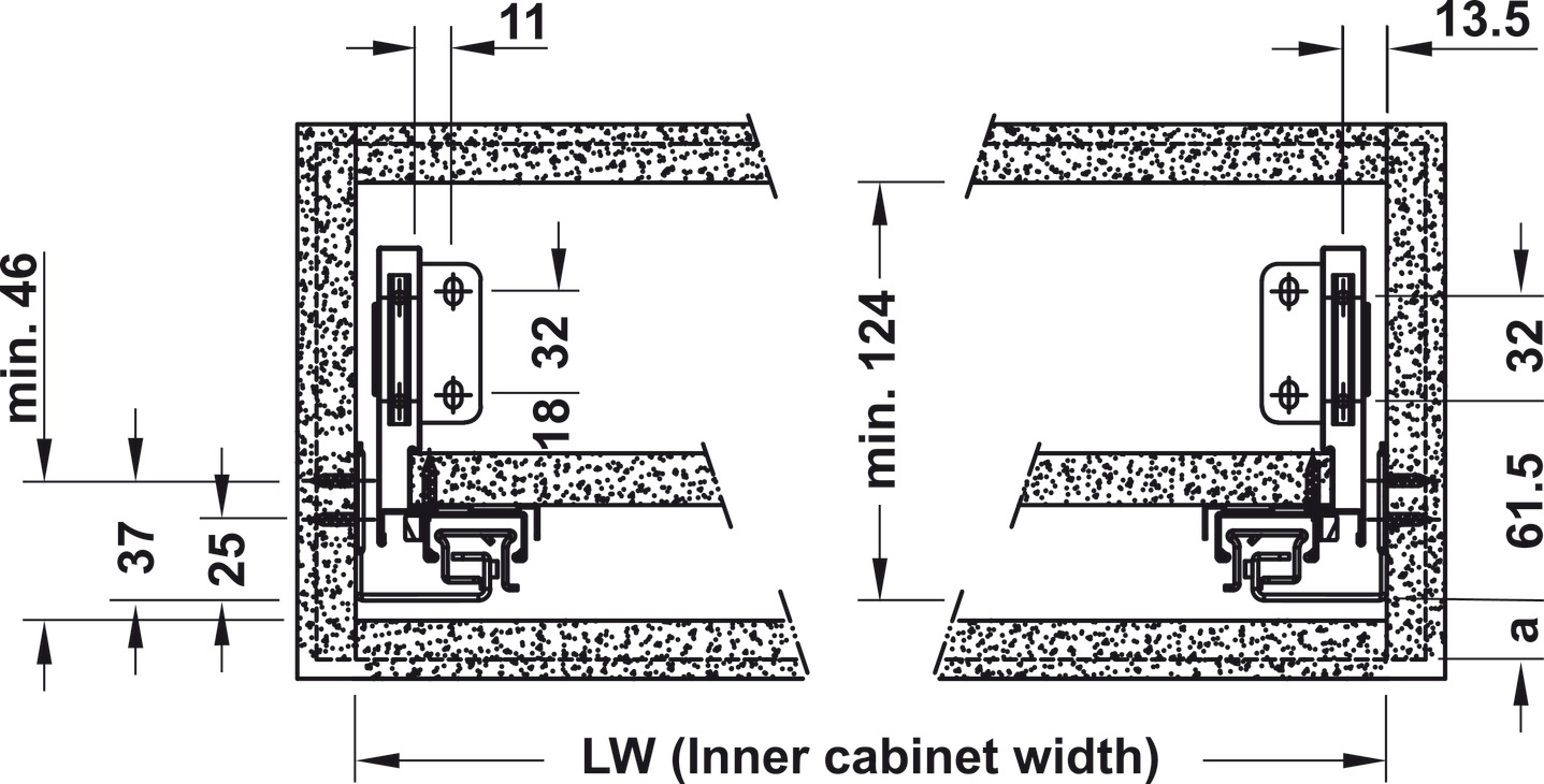 Tải trọng ngăn kéo 30kg; Chiều cao vách S2: 80mm; Chiều dài ray (L): 500mm; Chiều cao lọt lòng: ≥ 124mm; |