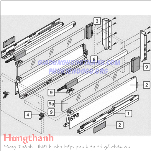- Ray bắt vào hai bên hông hộc tủ, ray và THÀNH hộp có thể thÁo lắp dễ dàng