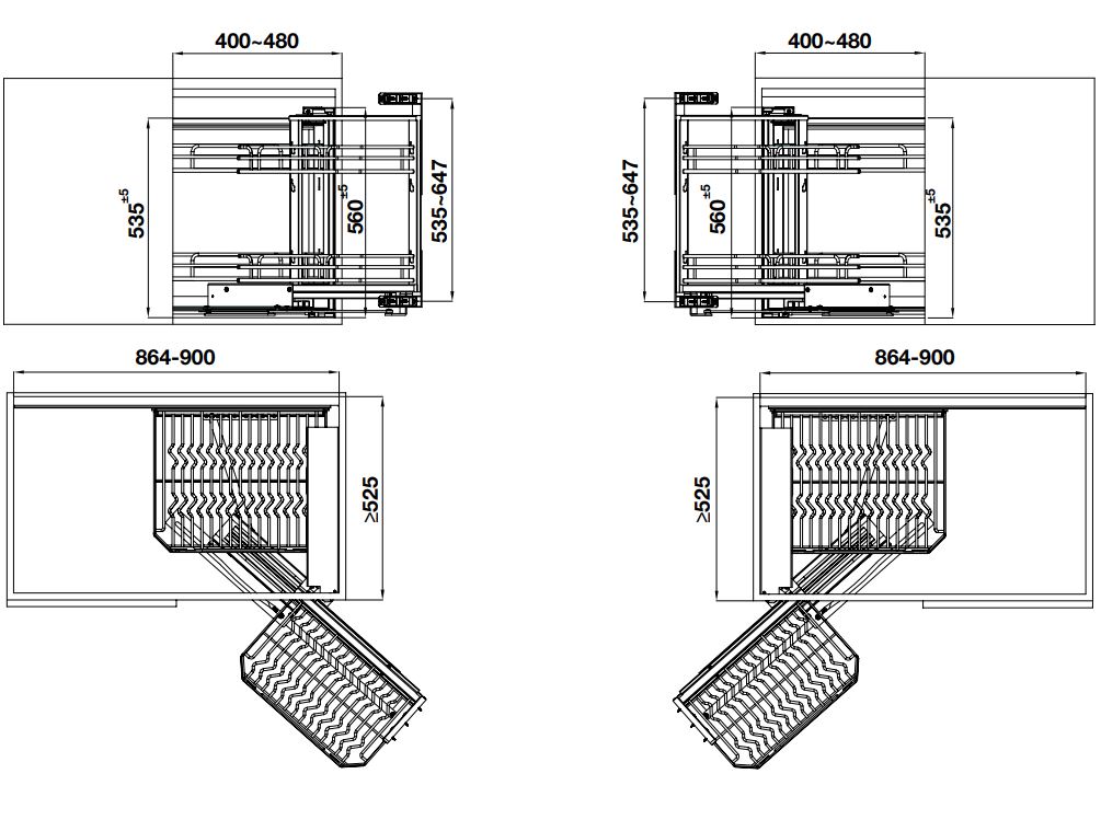Rộng cửa 400-480mm Sâu min.525mm Rộng rổ góc 864-900mm Cao min.560mm |