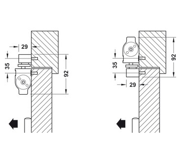 - Phương pháp gắn lắp: Lắp đặt tiêu chuẩn (lắp trên cánh cửa) bên phía kéo cánh cửa, lắp đặt trên khung cửa, (bắt treo trên) bên phía kéo