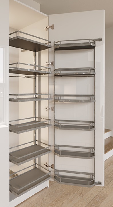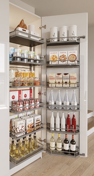 - Hô biến những chiếc tủ cao trong bếp thành tủ đồ khô đa năng với các hệ phụ kiện Kosmo: Thiết kế đa dạng với nhiều khay sức chứa lớn để bạn tha hồ lưu trữ mọi thứ từ thực phẩm đóng hộp, ngũ cốc, dầu ăn đến cả dụng cụ ăn uống…