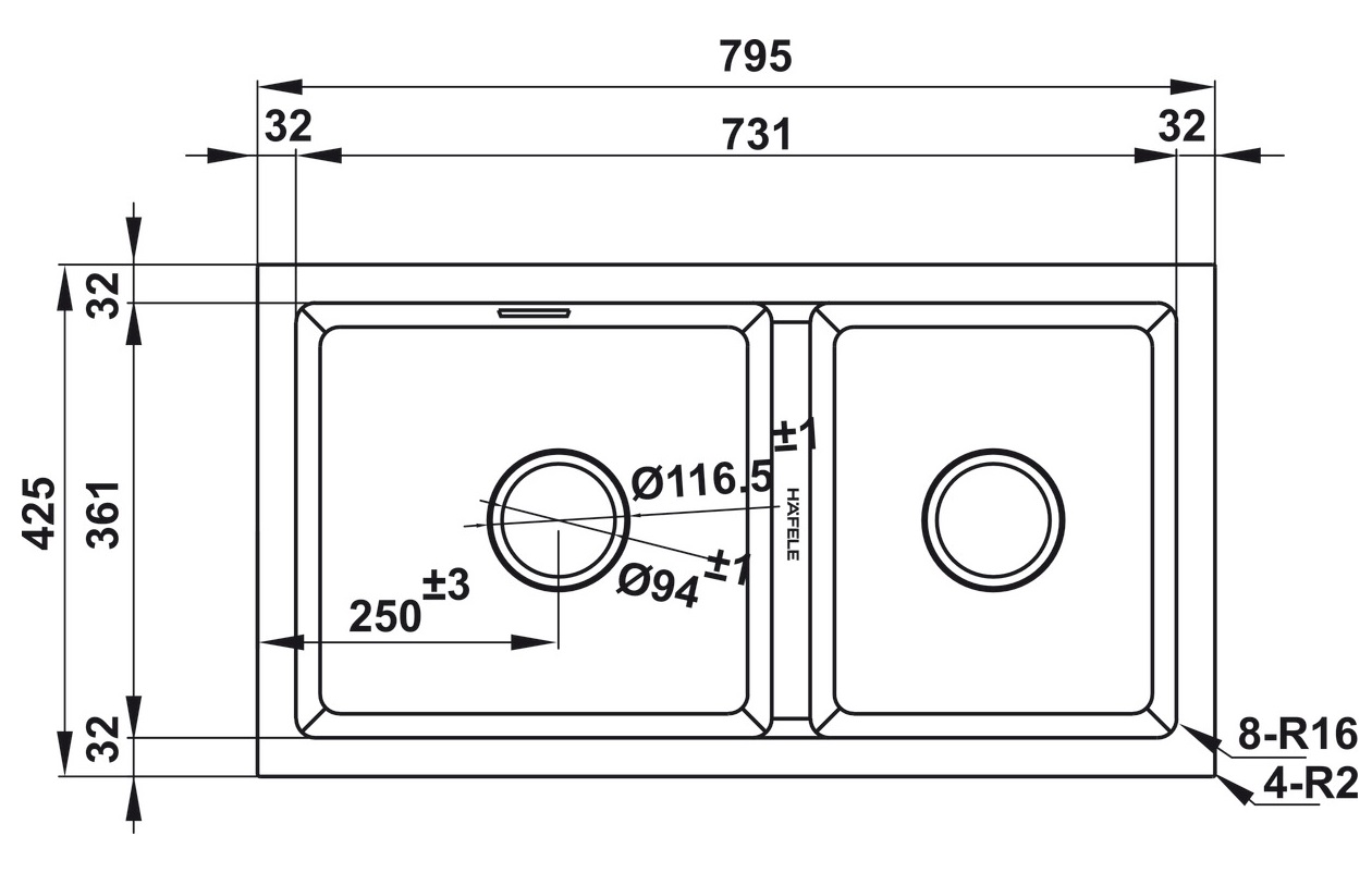 * Thông số kỹ thuật chậu đá 2 hố Hafele HS22-GEN2S90 màu đen 577.25.310: