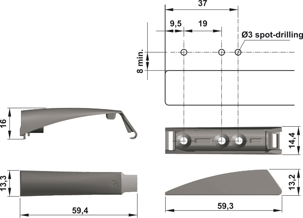 1. Tên hàng: Đế nêm nhấn mở Hafele 356.12.527 ( Dài, xám)