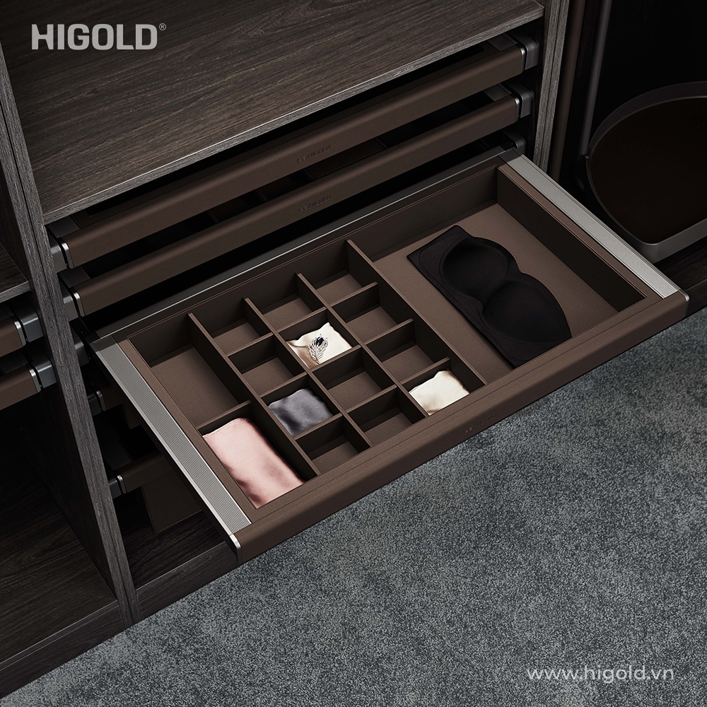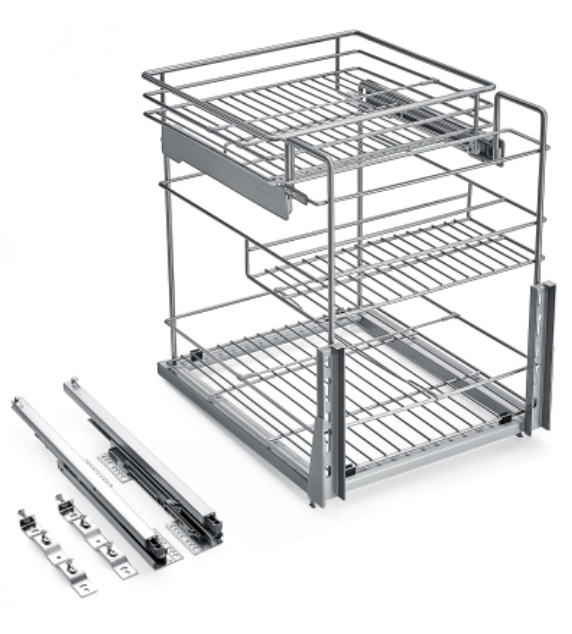 Đóng bộ sản phẩm: thùng khay, khung và các ray trượt toàn phần giảm chấn.