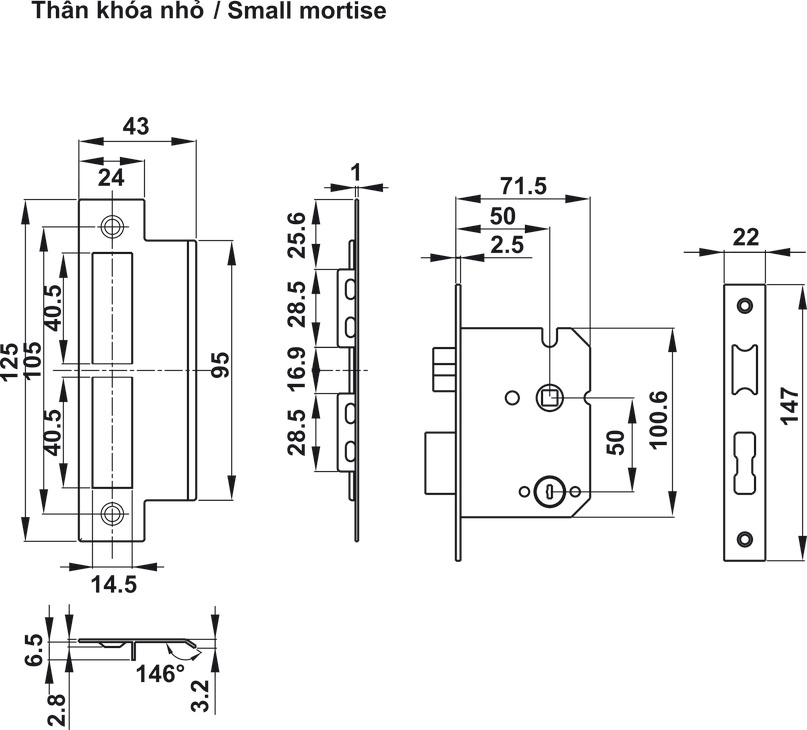 - Khóa có thể phù hợp lắp loại thân to (60x68mm), thân nhỏ (50x50mm).