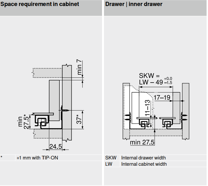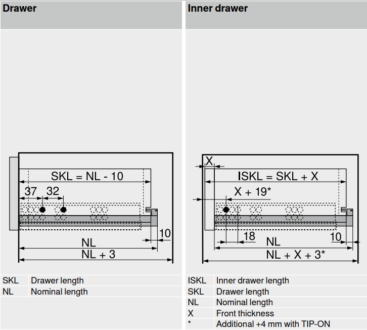 Khoảng hở ngăn kéo tới vách mỗi bên 5-7.5mm Chiều sâu ngăn kéo: Dài ray (NL) -10mm Chiều sâu tủ: Dài ray (NL) +7mm |