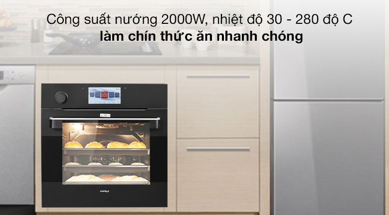 - Nướng với khí nóng tuần hoàn của lò nướng kết hợp hấp Hafele HSO-T60A 535.02.711 Iconic cho kết quả hoàn hảo nhờ phân phối nhiệt đồng đều, cho phép nướng đồng thời tối ưu ở cả 2 khay cùng một lúc.