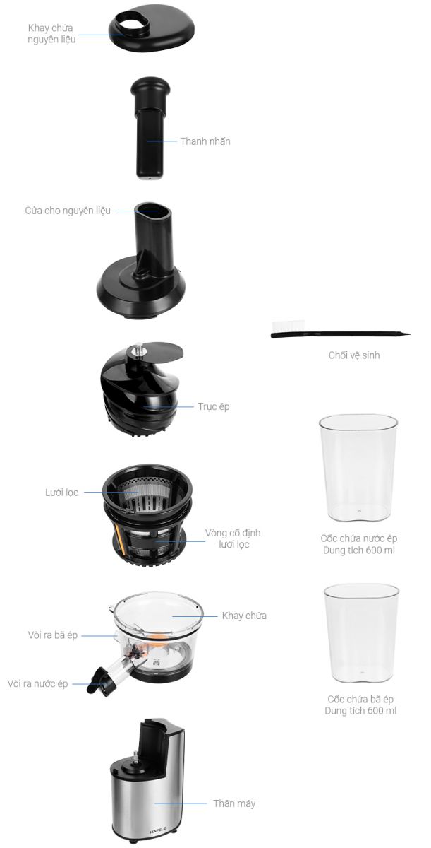 Sản phẩm: Đóng hộp máy ép, 2 cốc 600ml, phụ kiện kèm vệ sinh, hướng dẫn sử dựng.