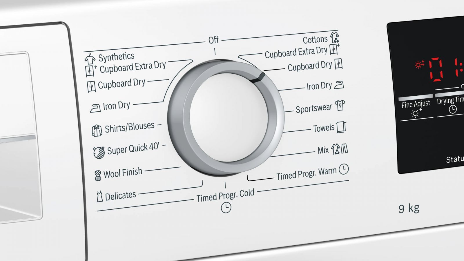 - Tinh chỉnh (Fine Adjust): điều chỉnh độ khô nếu trong trường hợp quần áo sau khi sấy vẫn còn ẩm / khô quá. Có thể lưu lại chương trình tinh chỉnh để dùng cho các chương trình khác, không bị mất khi tắt máy.