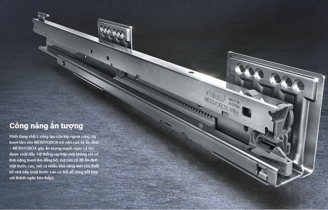 - Chức năng: bộ ray hộp Merivobox dùng cho ngăn kéo đa dụng từ tủ bếp, tủ quần áo và tủ cho văn phòng.