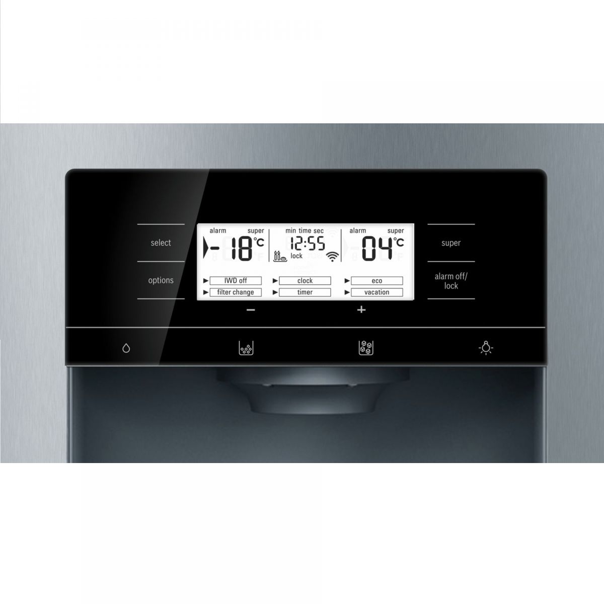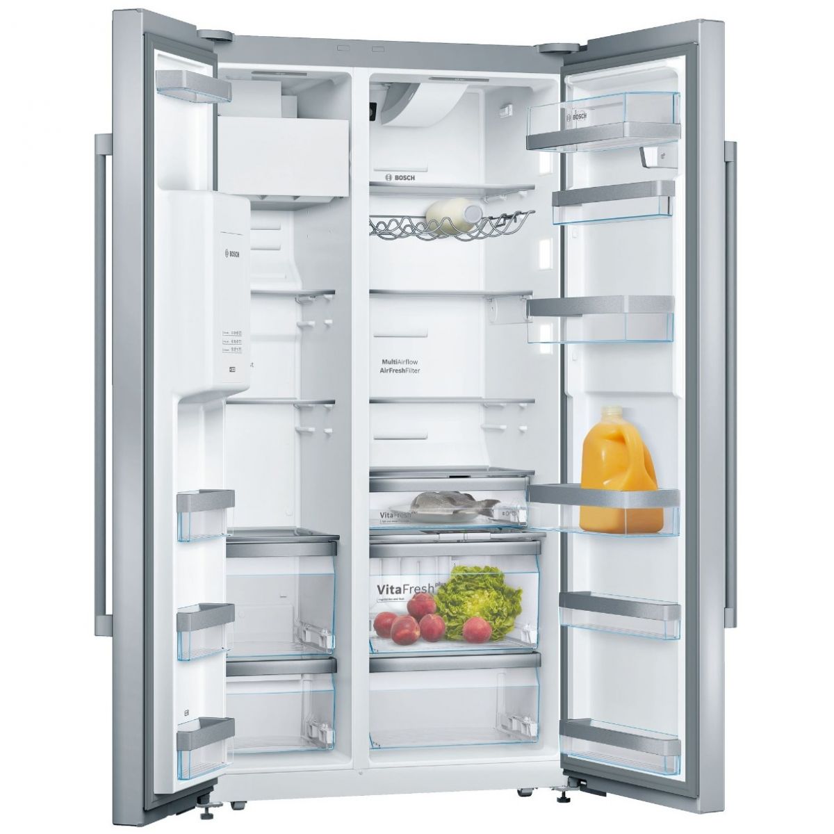 - BottleRack: Giá đỡ chai BottleRack của tủ lạnh side by side Bosch KAD92HI31 Series 8 làm bằng thép không gỉ với thiết kế gợn sóng giúp chai lọ của bạn được an toàn. Chai lọ sẽ được làm lạnh lý tưởng và đồng đều ở mọi phía, vì vậy tủ có thể cung cấp cho bạn nhiều đồ uống giải khát vào những ngày nóng.